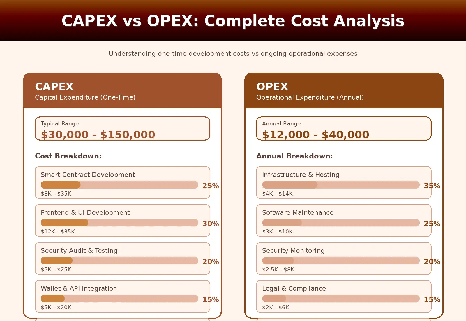 One-time development costs (CAPEX) include initial smart contract development, frontend and backend coding, admin dashboard creation, wallet integration, basic security implementation, initial smart contract audit, and project management. These costs range from $30,000 to $200,000+ depending on scope.