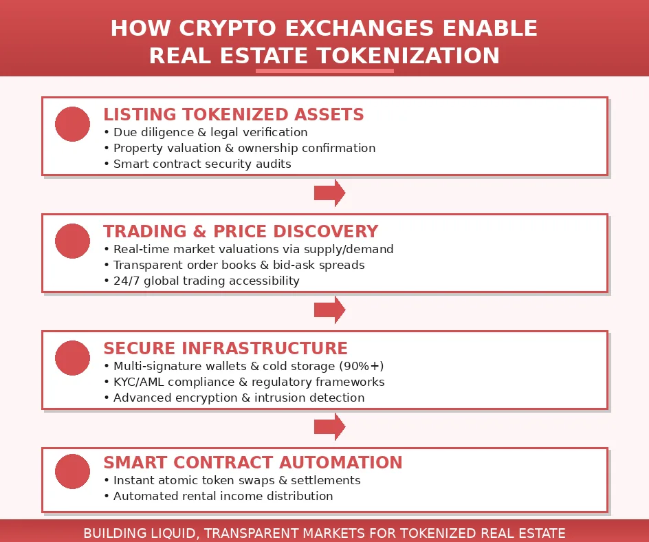 - Crypto exchanges provide the essential infrastructure for listing, trading, and managing tokenized real estate assets, transforming illiquid property investments into tradable digital securities accessible to global investors.