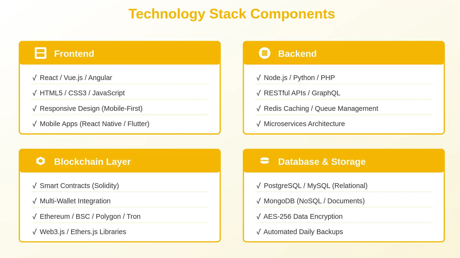 The frontend can be built with React, Vue.js, or Angular. React is our preferred choice because it handles complex state management well and has a large ecosystem of components. Mobile apps use React Native or Flutter to maintain a single codebase across iOS and Android. This reduces development time by 40% compared to building native apps separately.