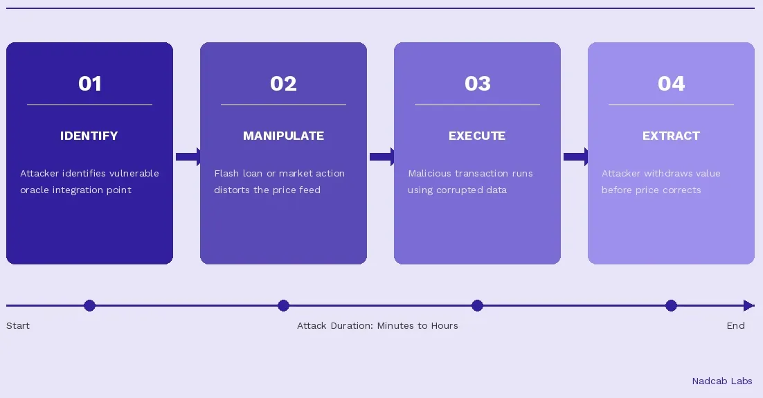 Oracles serve as the bridge between blockchain networks and external data, providing price feeds, event outcomes, and other information that smart contracts need to function. This critical role makes oracles attractive targets for attackers who can manipulate data feeds to trigger favourable contract executions or liquidations.