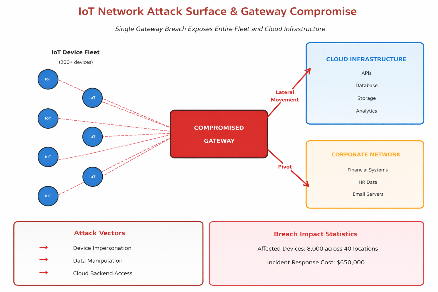 Gateway compromise provides the same access as breaching every connected device—plus lateral movement into backend systems.
