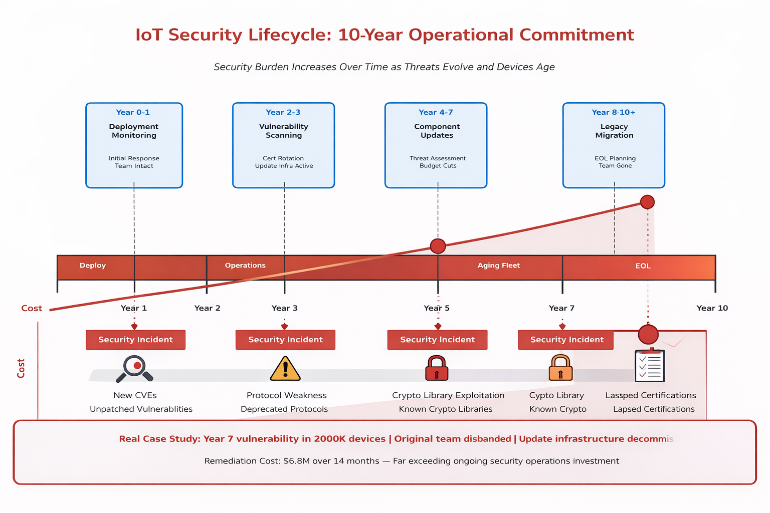 We manage deployments where the biggest security challenges emerged 3-5 years post-deployment, not during initial rollout. The challenge is that IoT security is a 10-year operational commitment, not a pre-deployment project phase. The security burden increases over time as threats evolve and devices age. Vulnerabilities discovered in component libraries three years after deployment still need patching. Compliance frameworks change, requiring architectural updates. Attack techniques evolve, making previously secure protocols vulnerable. Most organizations budget for development and deployment security but not for decade-long operational security, then face impossible choices when critical vulnerabilities emerge in deployed fleets years later with no budget or expertise to address them.