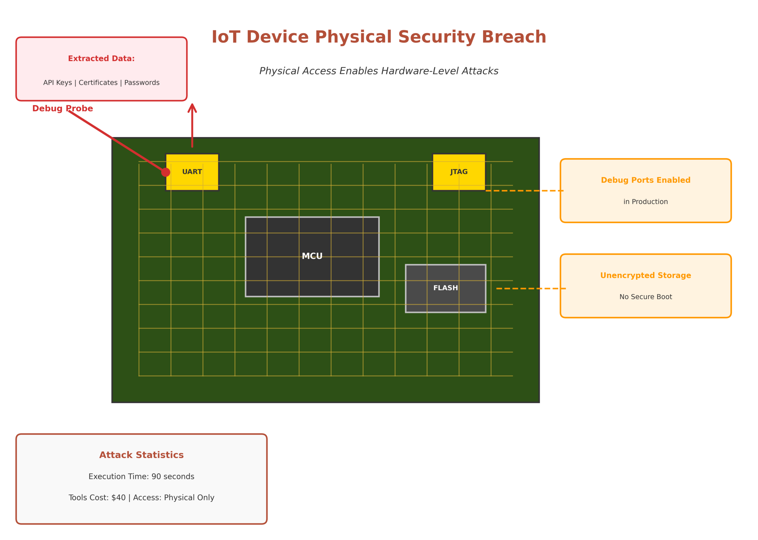 Physical access to IoT devices changes everything. Unlike servers in locked data centers, IoT devices sit in parking lots, forests, customer premises, and public spaces where attackers have unlimited time and physical access.